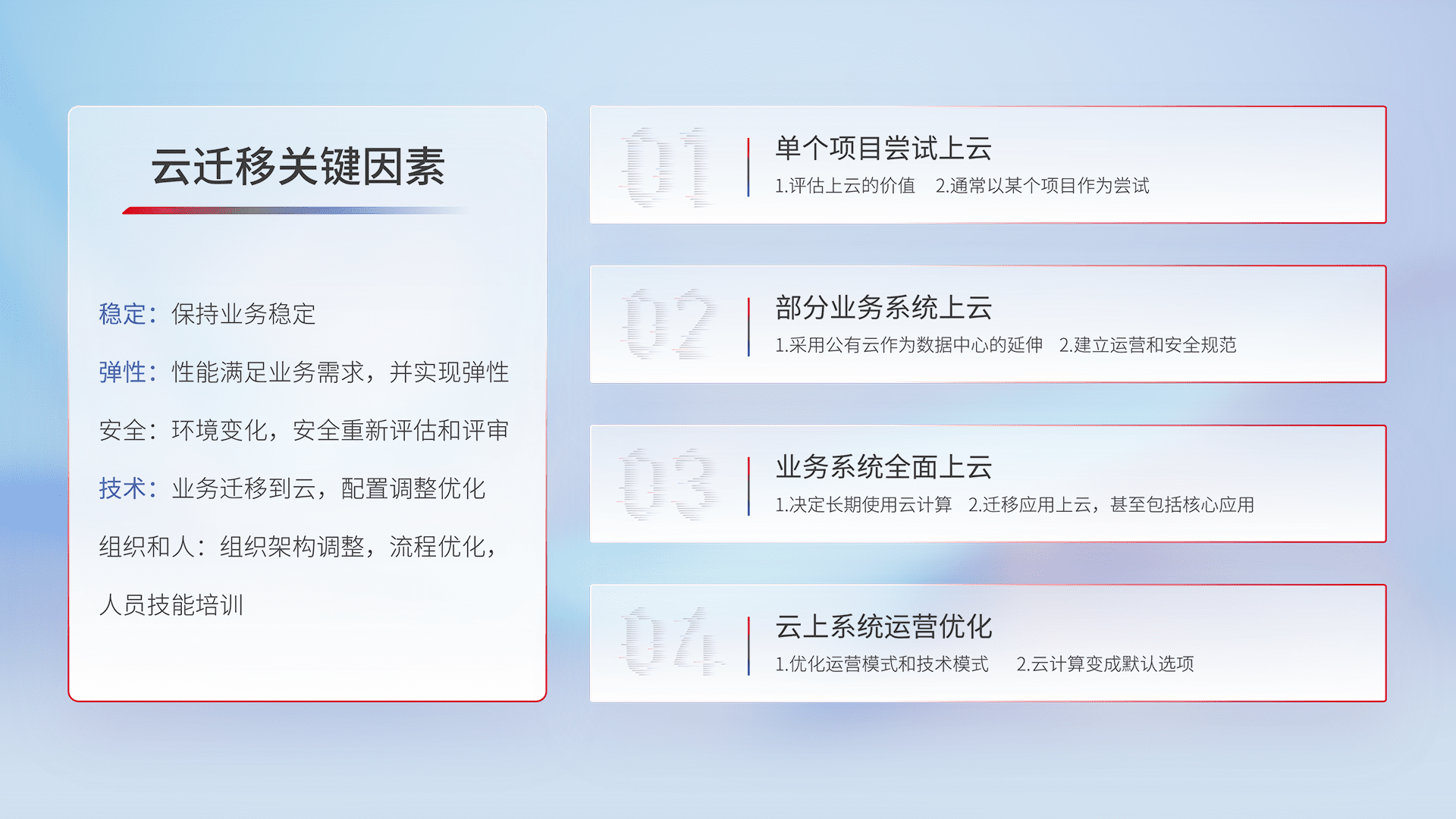 结合实际业务,,从规划设计、、、云平台选型、、、云原生改造、、数据迁移、、、集成交付,,,,迁移全过程为客户识别最佳上云路径,,,,做好风险识别管理,,,设计网络架构、、身份权限、、、、安全审计合规、、、操作审计、、、、日志审计、、监控告警策略、、、多站点容灾设计等,,对云上基础设施进行整体规划,,提升IT治理水平,,,以满足弹性、、、高可用、、、高性能的需求。。。。