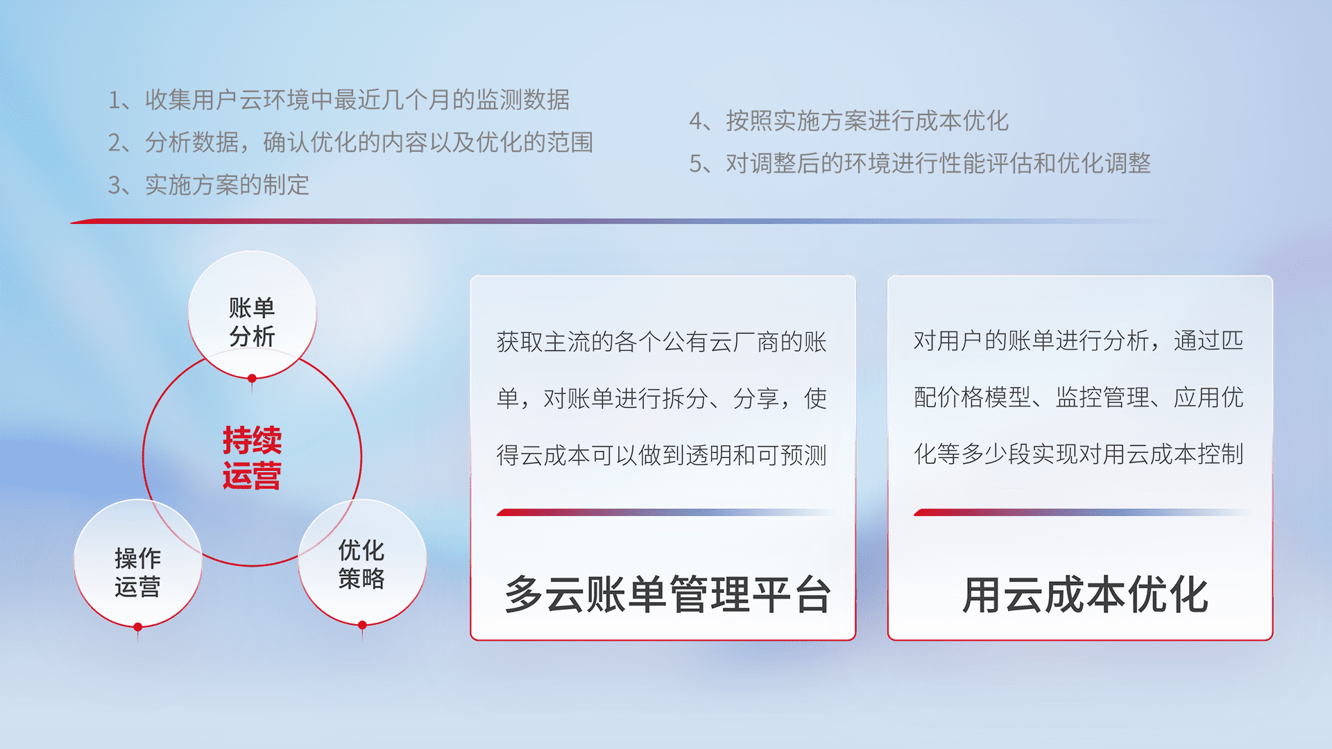 通过多云纳管,,,以统一的资源数据模型把客户的云资源进行抽象和封装,,,,进而实现对多云资源的统一操作,,保障云资源管理的可靠性、、、、稳定性与可用性。。量身定制化运维内容,,,配置、、、、开发运维、、、、补丁管理、、、备份、、、、监控、、、认证和访问管理、、、审计和日常巡检等,,,保障在用云过程中的可靠度,,,,稳定度以及高可用率。。。。